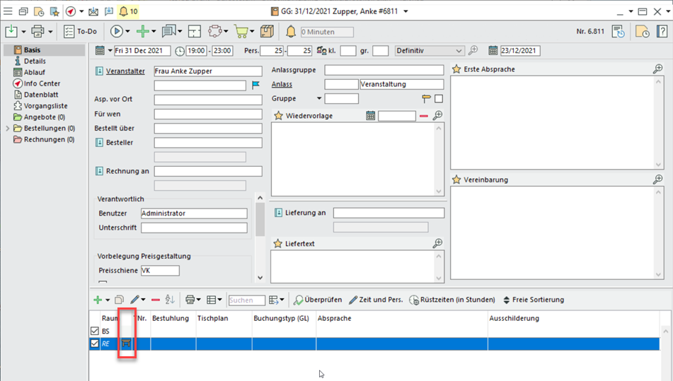 Mit Rechtsklick auf das Icon "Reservierung anzeigen" öffnet sich die Reservierung. Mehrere Reiter sehen Sie, wenn sich die Veranstaltung über mehrere Tage oder innerhalb eines Tages über mehrere Tischreservierungs-Veranstaltungen erstreckt.