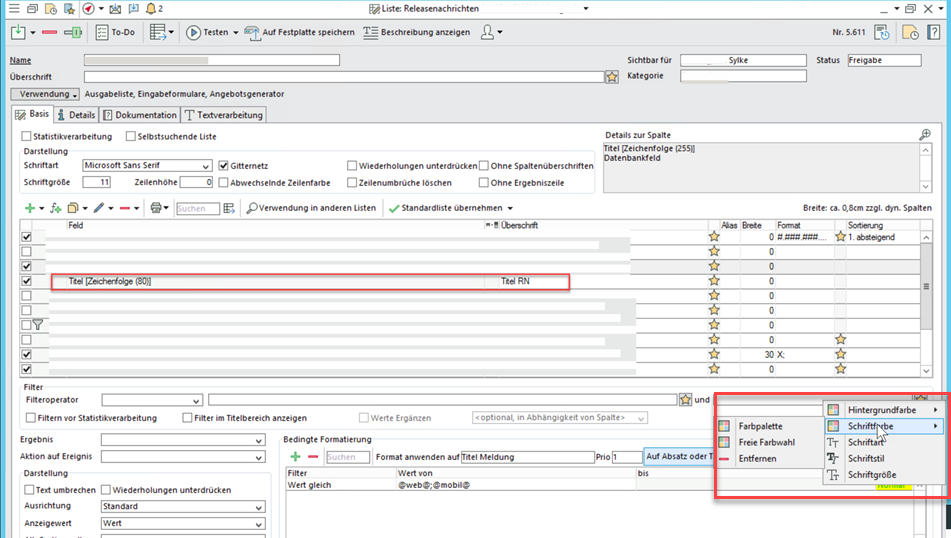 Aktivieren Sie dafür in der Listendefinition Bedingte Formatierung > Auf Absatz oder Tabellenzelle anwenden, und wählen Sie mit Rechtsklick in die Spalte "Format" Hintergrundfarbe, Textfarbe bzw. Textstil aus.