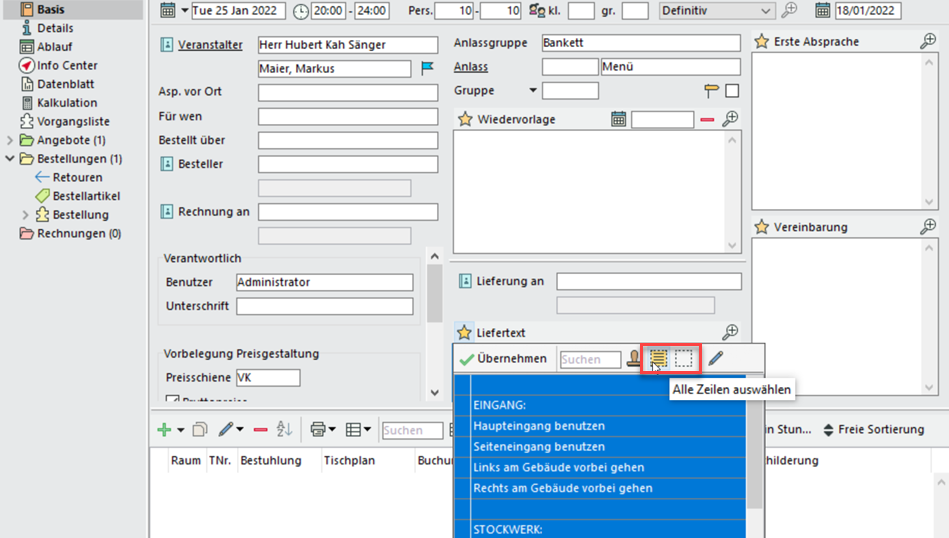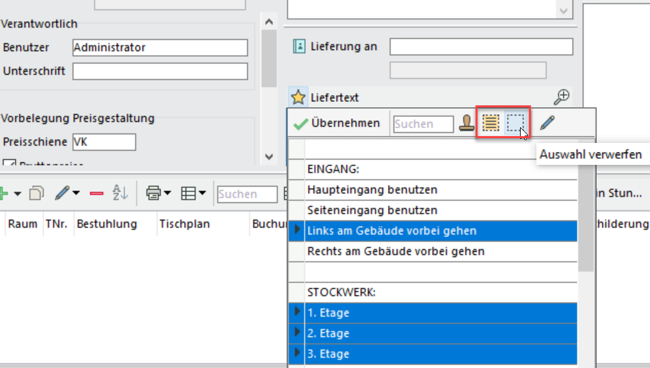 Wählen Sie in allen einspaltigen Auswahldialogen über das Icon "alle" Zeilen aus, oder verwerfen Sie die Auswahl komplett.