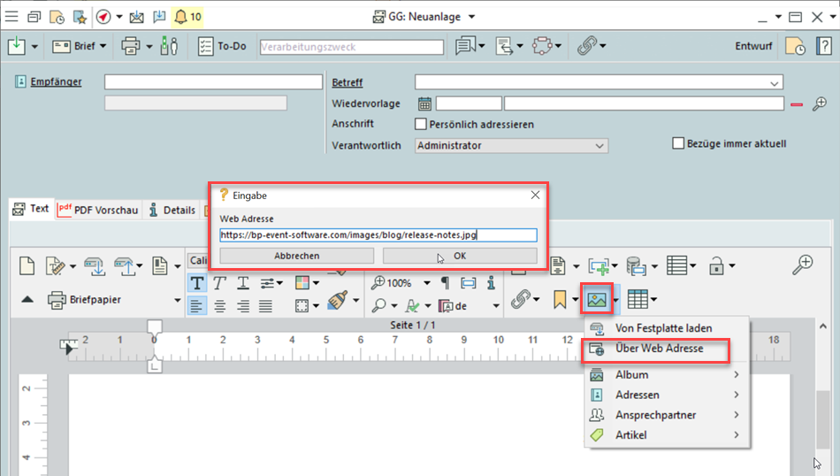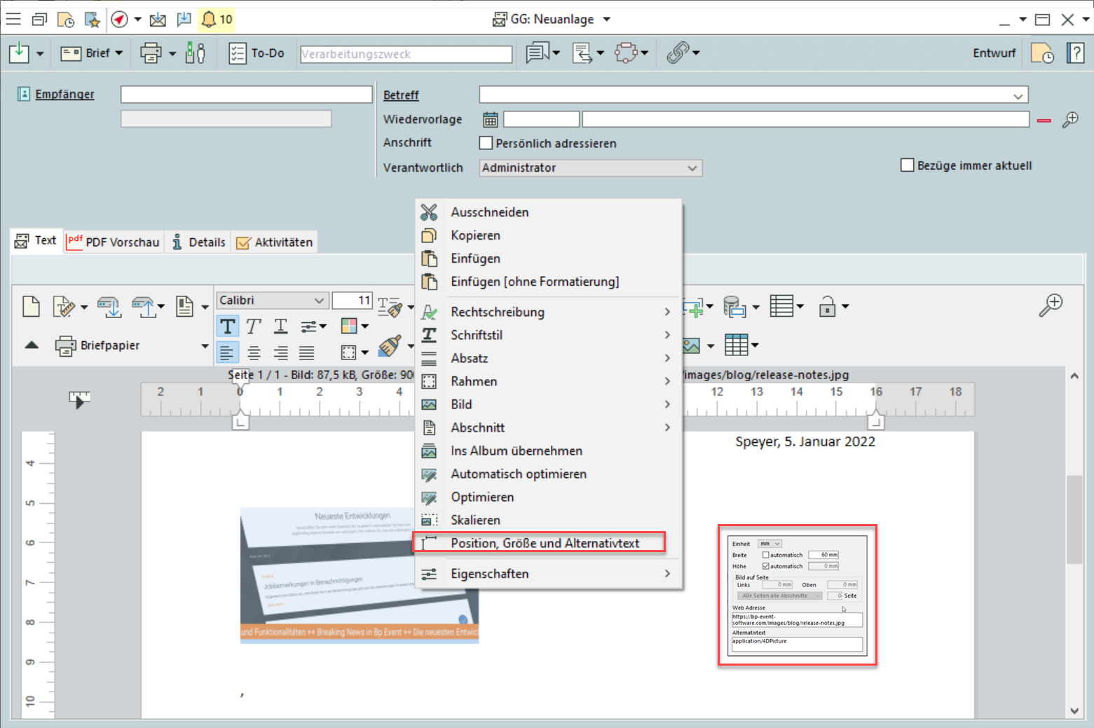 In HTML oder 4wp-Format (E-Mail, E-Mail-Anschreiben) bleibt das Bild klein, weil nur die URL gespeichert wird. Wird in PDF- oder DOCX-Format gespeichert, dann wird das Bild selbst heruntergeladen.