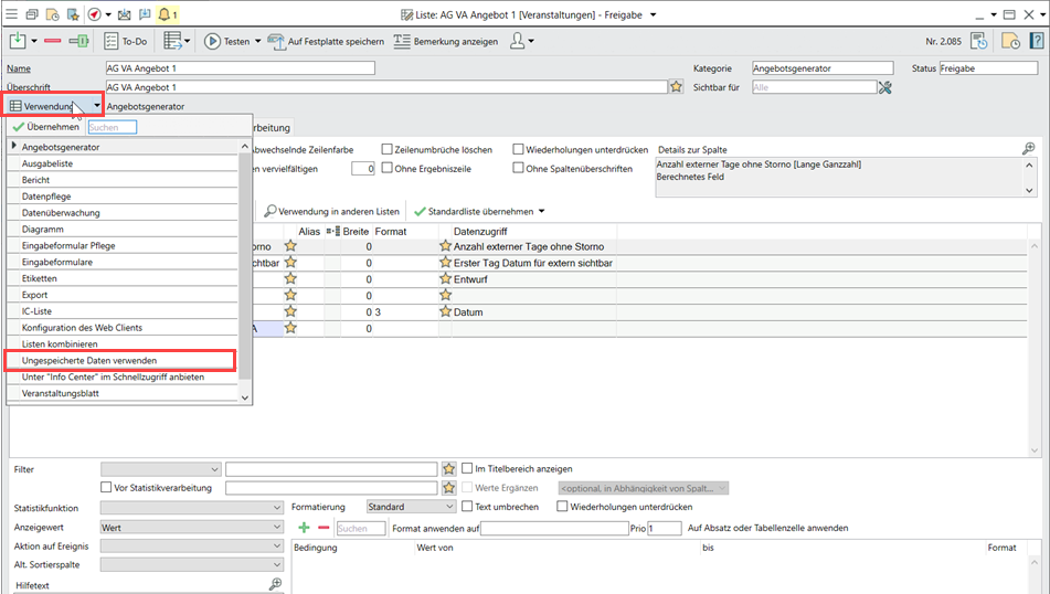 "Ungespeicherte Daten verwenden" als Option unter "Verwendung"