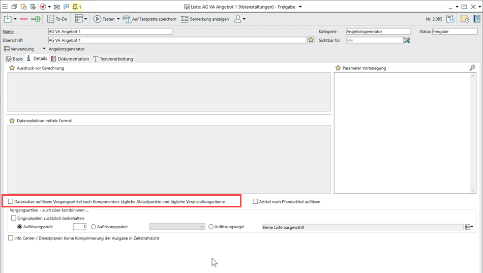 zusätzliche Optionen, u.a. zum Auflösen von Vorgangsartikeln auch für Selektionen, Formeln und Regeln und verbesserter Aufbau