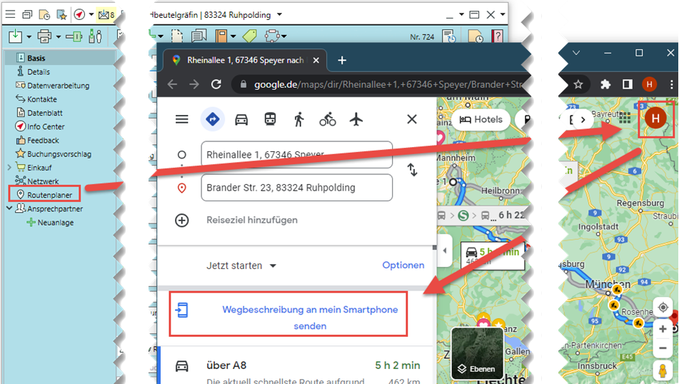 Legen Sie unter Optionen > Einstellungen fest, dass der Routenplaner aus Bp Event direkt in einem externen Browserfenster geöffnet wird, um dort dann alle von Google bereitgestellten Funktionen (z.B. Routenplanung an eigenes Smartphone senden) nutzen zu können.