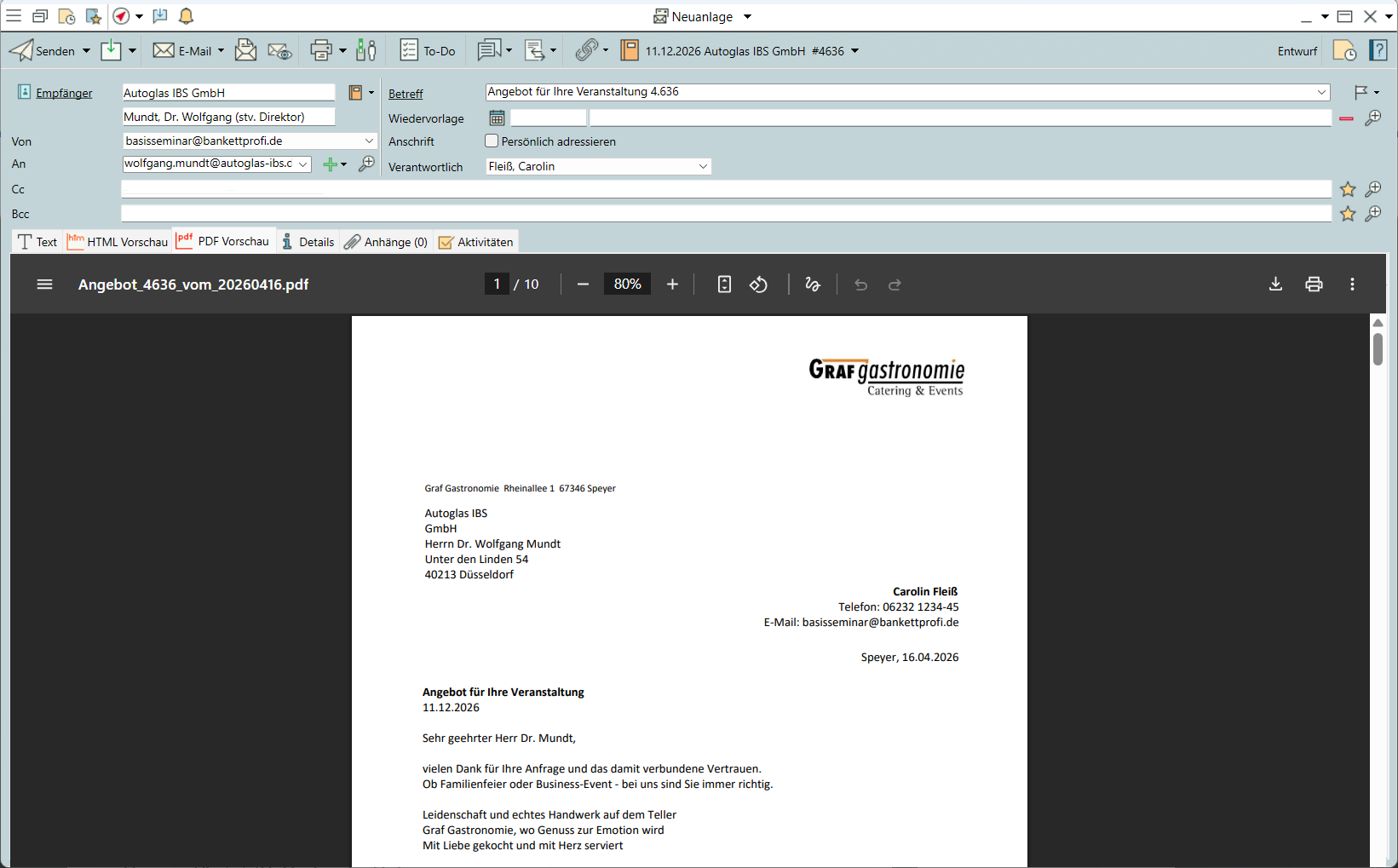 Brief / E-Mail > belegen den Empfänger vor und wählen aus dem Kontextmenü die passende Vorlage für Ihre E-Mail. - Achten Sie in der Werkzeugleiste auf die Vorbelegung der Versandart