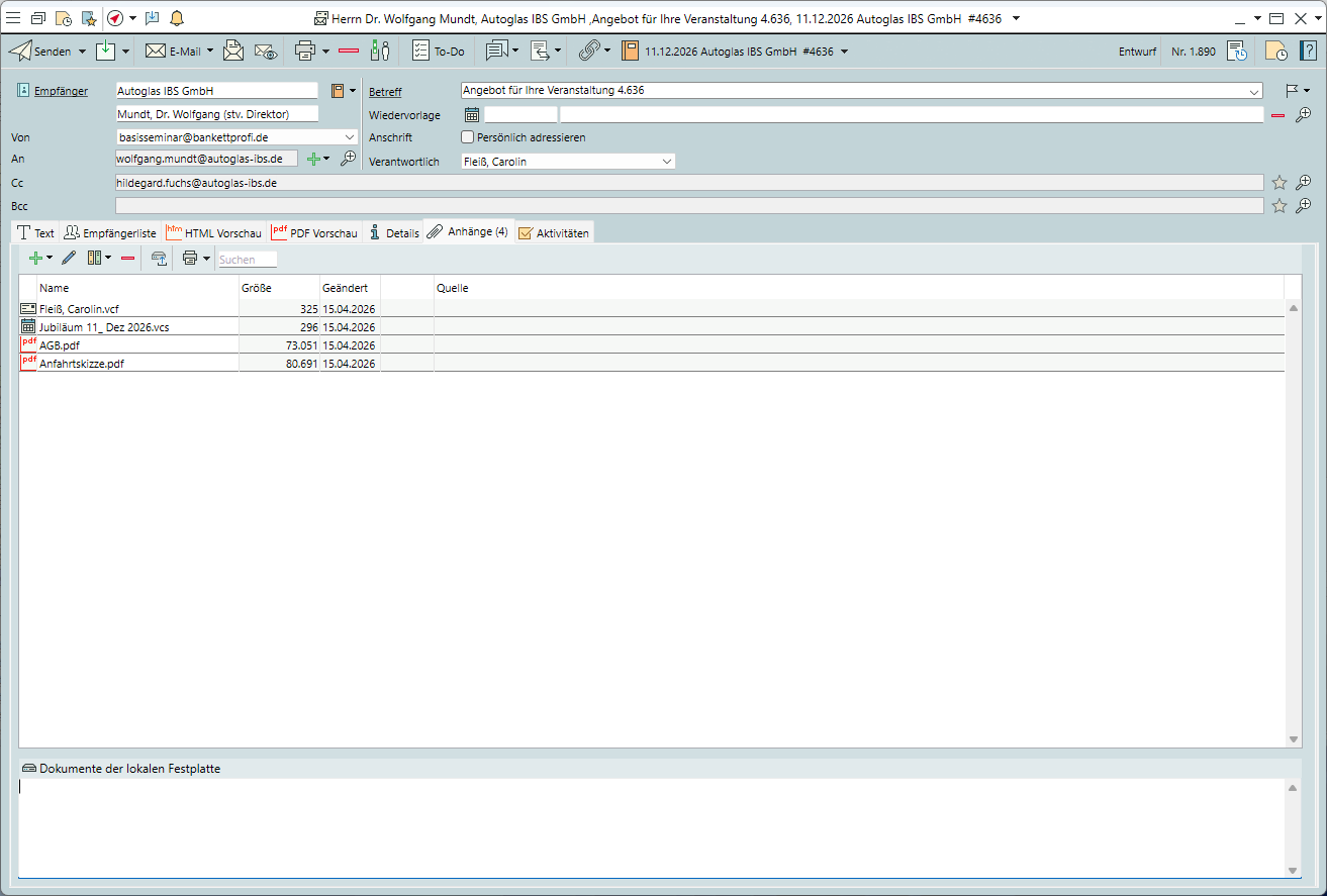 Dateien (Bp Event-Dokumente, externe Dateien, Visitenkarten oder Kalendereinträge) als Anhänge zu der E-Mail hinzu. - Senden Sie die E-Mail über