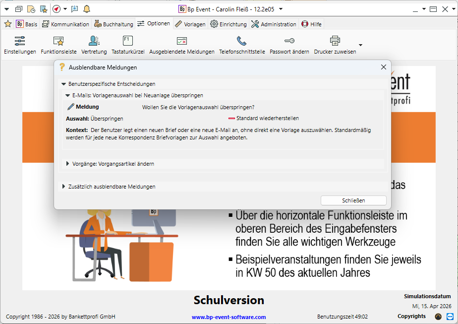 - Interne Nachrichten lesen - Setzen Sie den Haken Vertreter benachrichtigen, um den Vertretenden automatisch bei Anmeldung am Bp Event über den Vertreterstatus zu informieren.
