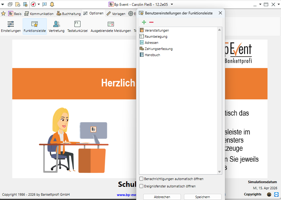 Favoritenreiter erscheint ab sofort direkt neben dem Schnellzugriff links auf der Funktionsleiste. - Im unteren Bereich können sie das automatische Öffnen des Benachrichtigungs- und EreignisfenstersM aktivieren.