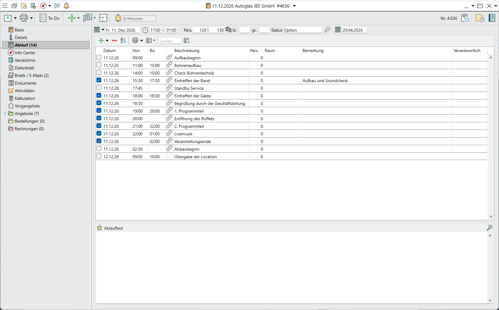 - Um den Ablaufpunkt als „interne Information“ zu markieren, entfernen Sie den Haken in der ersten Spalte. Der Ablaufpunkt erscheint dann nur auf internen Ausdrucken.