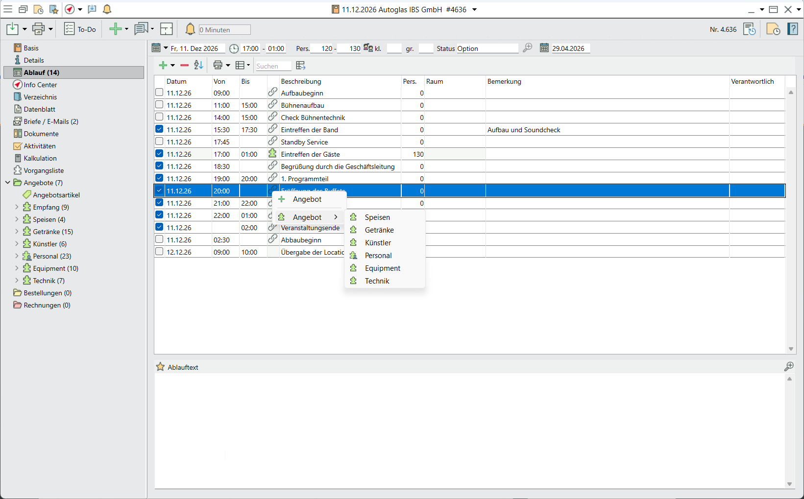 Veranstaltungsvorlagen mit Veranstaltungsablauf. - Wählen Sie einen Ablaufpunkt mit Klick auf den jeweiligen Ablaufpunkt im Kontextmenü. Klicken Sie auf