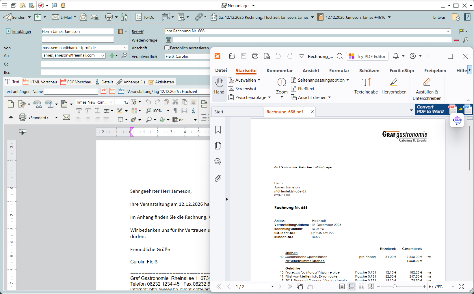 (rechts neben dem Drucker in der Werkzeugleiste). Es öffnet sich eine E-Mail mit der Rechnungsadresse und Verknüpfungen zu der gewählten Veranstaltung und dem aktuellen Vorgang. - Wählen Sie auf Nachfrage zwischen einem Kundenausdruck mit Rechnungsausgangsdatum oder einem undatierten Probedruck. Das Rechnungsausgangsdatum ist entscheidend für die Berechnung des Zahlungsziels und somit auch das Auslösen des Mahnlaufs.