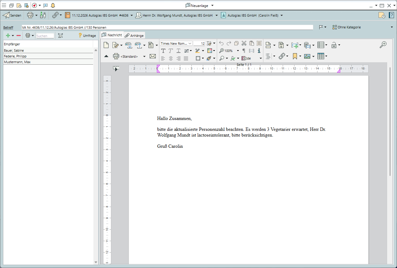 Aus manchen Datensätzen heraus können direkt interne Nachrichten gesendet werden, um Kollegen über Details beispielsweise zu einer Veranstaltung zu informieren.